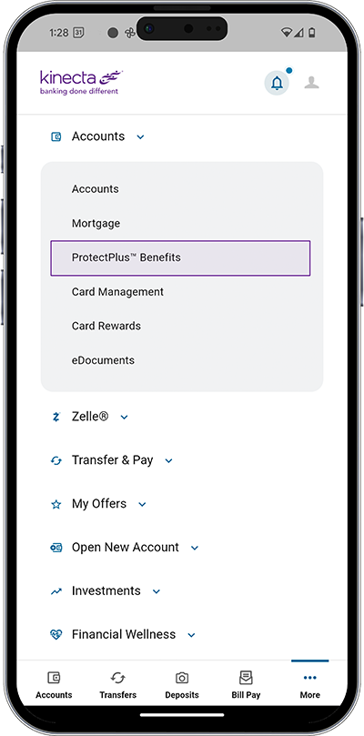 Access your benefits anytime by navigating to Accounts in the main menu and selecting ProtectPlus Benefits.
